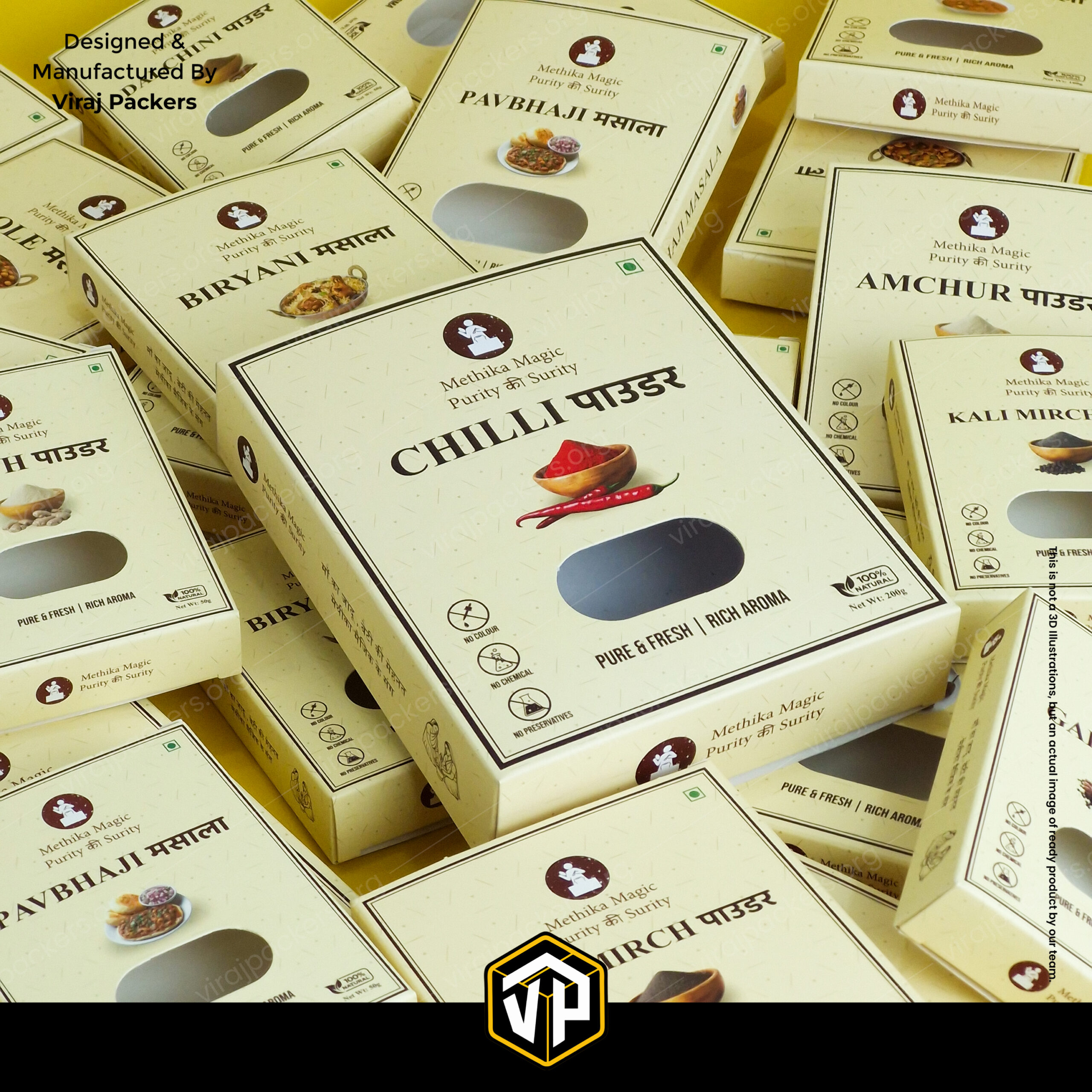Available in 50gm, 100gm, and 200gm capacities, this packaging is ideal for chilli powder, turmeric, coriander powder, garam masala, pav bhaji masala, biryani masala, amchur powder, and other blended spices.